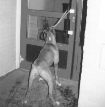 Husse eller matte lägger en ögla (kampsnöre) om dörrhandtaget eller portens handtag. Hunden greppar tag i andra änden och drar bakåt tills portdörren har öppnat sig en bit. Då kilar husse eller matte in rullstolen i dörröppningen, hakar av repet, släpper in hunden och går in själv.